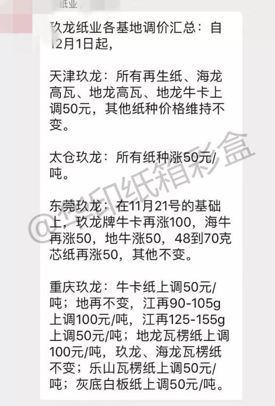 1、玖龍、理文、山鷹三巨頭再次集體漲價,掀起12月“漲價潮” 東莞玖龍:12月1日起,在11月21日的基礎上,玖牛漲100元/噸,海牛漲50元/噸,地牛漲50元/噸,瓦紙48-70g漲50元/噸,其它價格不變。 太倉玖龍:12月1日起,所有紙種上調50元/噸。 天津玖龍:12月1日起,所有再生紙、海龍高瓦、地龍高瓦、地龍牛卡上調50元/噸,其它紙種價格維持不變。 重慶玖龍:地龍灰底白、江龍灰底白、海龍灰底白上漲50元/噸。