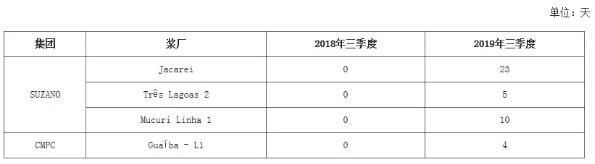 去產量 漿廠檢修時間增加 巴西統計部門公布數據顯示,2019年三季度巴西木漿產量501.90萬噸,環比下降1.53%,同比下降7.82%。產量同環比均下降,主要是受到Suzano公司主動降產量,2019年5月5日Suzano發布公告計劃減產紙漿年產量100萬噸以上,從圖1也可以看出,發布公告后各月的產量均較去年同期出現下滑。表1所示的是漿廠的檢修時間,2018年三季度巴西主要漿廠沒有檢修情況,而今年三季度檢修時間達到42天,且主要集中在Suzano旗下的漿廠。經過漿廠主動降產量后,三季度Suzano紙漿產量209.5萬噸,同比下降24%,環比下降6%;CMPC紙漿產量106.6萬噸,同比下降1%,環比下降2%。 表1 巴西漿廠檢修情況