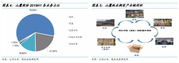 山鷹紙業是目前國內僅有的一家集再生纖維回收、造紙、包裝、印刷、貿易、物流、投融資等為一體的國際化紙業集團,造紙及包裝印刷規模均位居全國前列。其箱板紙產能和市占率穩居均位居行業前三,同時在海外積極布局,已擁有9家造紙企業和23家包裝印刷設計及生產企業。公司2017年下半年收購了北歐紙業,于2018年分別收購了歐洲的WPT和北美的鳳凰紙業。2018年,北歐紙業實現凈利潤2.45億元人民幣。2018年8月至12月,WPT實現凈利潤1082萬元人民幣。北美鳳凰紙業已于2019年5月底開始生產。 公司產業上端有國內外廢紙收購網絡,產業下端在全國各地布局紙箱廠,這種產業布局可以使公司及時、準確、全面地掌握廢紙和原紙的市場價格信息,有利于公司適時調整原材料和產品的定價策略,從而控制生產成本。受益于產業鏈協同效益,公司的包裝產業也將成為新一輪的利潤增長點,逐漸成為與造紙產業并重、支撐公司戰略的驅動力。 公司投資新建的華中造紙基地,預計2019年一、二期項目完工后年產能可達127萬噸,屆時公司年規劃產能規模將接近600萬噸,有望進一步降低成本,公司在積極擴張產能,強化規模優勢。 公司主營業務為箱板紙、瓦楞原紙、特種紙、紙板及紙箱的生產和銷售以及國內外再生纖維貿易業務,主要產品為“山鷹牌”各類包裝原紙、新聞紙及紙板、紙箱、“Nordic Paper”特種紙等紙制品。截止2019年三季度,公司實現原紙產量352.19萬噸,銷量348.43萬噸,產銷率98.93%;瓦楞箱板紙箱產量9.18億平方米,銷量9.42億平方米,產銷率02.61%。公司包裝紙產銷量位居中國第三,占中國市場份額為9%,在中國的華東市場占據25%份額,排名第一。公司包裝板塊銷量位居中國第二,整體市場份額為1.6%。