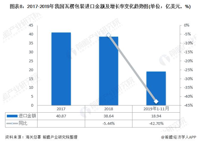瓦楞包裝行業(yè)進(jìn)口稅率下降 有望繼續(xù)拉動(dòng)進(jìn)口增長(zhǎng) 2017-2019年,我國(guó)瓦楞包裝行業(yè)產(chǎn)品進(jìn)口金額呈逐年下降趨勢(shì),降幅加速。2017年,我國(guó)瓦楞包裝進(jìn)口金額為40.87億美元;2018年,我國(guó)瓦楞包裝進(jìn)口金額為38.64億美元,同比下降5.44%;2019年1-11月,我國(guó)瓦楞包裝進(jìn)口金額為18.94億美元,同比下降42.70%。