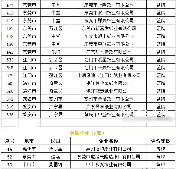 2020年3月12日,廣東省生態環境廳對2018年廣東省企業環境信用評價結果進行了公示,公示期為2020年3月12日至3月26日。公示名單中,獲得2018年廣東省企業環境信用評價“綠牌企業”的紙企共13家,“藍牌企業”共29家,“黃牌企業”共3家,沒有紙企被評為“紅牌企業”。