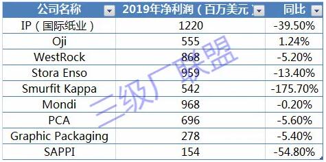 Smurfit Kappa雖然在營業收入上保持了1.1%的增長,但凈利潤卻暴跌至5.42億美元,同比減少175.70%,創2019年凈利潤最大跌幅。 備注:根據工信部數據,2019年我國造紙及紙制品業營業收入13370.1億元,同比下降3.0%;利潤總額681.9億元,同比下降9.1%。