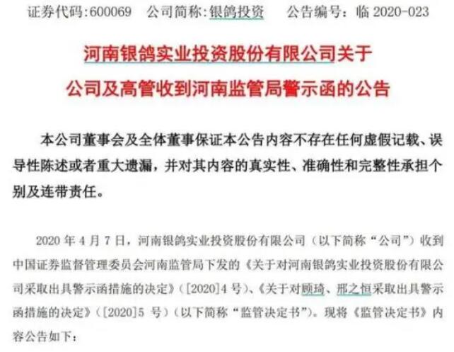 謊言4個(gè)月被戳穿 4月8日,銀鴿投資發(fā)布公告稱,4月7日,公司收到河南證監(jiān)局下發(fā)的《關(guān)于對(duì)河南銀鴿實(shí)業(yè)投資股份有限公司采取出具警示函措施的決定》《關(guān)于對(duì)顧琦、邢之恒采取出具警示函措施的決定》。 據(jù)河南證監(jiān)局調(diào)查,2018年11月21日,銀鴿投資作為保證人與某銀行簽訂最高額保證合同,為控股股東銀鴿集團(tuán)提供主債權(quán)最高限額為6.99億元的保證擔(dān)保,而銀鴿投資對(duì)該擔(dān)保事項(xiàng)未履行審議程序及信息披露義務(wù)。 據(jù)了解,銀鴿投資這一行為違反了《上市公司信息披露管理辦法》第二條、第三十條和《關(guān)于規(guī)范上市公司對(duì)外擔(dān)保行為的通知》第一條等規(guī)定。 根據(jù)《上市公司信息披露管理辦法》第五十九條規(guī)定,河南證監(jiān)局對(duì)銀鴿投資實(shí)施出具警示函的行政監(jiān)管措施,并記入證券期貨市場(chǎng)誠(chéng)信檔案。 作為銀鴿投資時(shí)任董事長(zhǎng)顧琦、時(shí)任董事會(huì)秘書(shū)邢之恒,在履職過(guò)程中未勤勉盡責(zé),同樣也違反了上市公司信息披露管理辦法的相關(guān)規(guī)定。河南證監(jiān)局對(duì)顧琦與邢之恒實(shí)施出具警示函的行政監(jiān)管措施,并記入證券期貨市場(chǎng)誠(chéng)信檔案。 記者了解到,去年12月7日,銀鴿投資發(fā)布公告稱,公司已自查2017年至2018年度公司印章使用登記,除公司已披露過(guò)的對(duì)外擔(dān)保事項(xiàng)外,未發(fā)現(xiàn)公司在其他擔(dān)保協(xié)議上加蓋公章的記錄,也未查到相關(guān)事項(xiàng)的授權(quán)委托記錄。 劇情的反轉(zhuǎn),前后經(jīng)歷了4個(gè)月的時(shí)間。