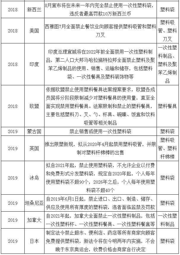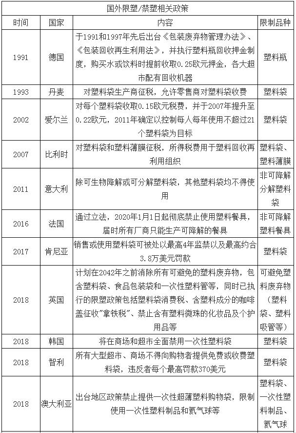 包裝行業(yè)塑料用量占全球塑料產(chǎn)量的近四成,其中飲用水瓶、食品包裝及塑料購(gòu)物袋是塑料污染的最重要的來(lái)源。目前全球已有超過(guò)60個(gè)國(guó)家對(duì)出臺(tái)多種措施限制一次性塑料制品的使用,從政策的演進(jìn)來(lái)看,前期政策主要針對(duì)一次性塑料袋,多使用征稅及禁止免費(fèi)提供塑料袋的方式來(lái)減少塑料袋使用,近年來(lái)多國(guó)限塑措施呈現(xiàn)加速和從嚴(yán)趨勢(shì),將“限塑令”向“禁塑令”升級(jí)并將針對(duì)范圍從塑料袋擴(kuò)大至塑料餐具。例如法國(guó)2016年通過(guò)立法,宣布2020年起徹底禁止使用塑料餐具,成為世界第一個(gè)禁止所有塑料餐具的國(guó)家;歐盟2015年首次通過(guò)減少使用塑料袋的規(guī)定,2018年議會(huì)再次提出議案擴(kuò)大“限塑”范圍,就全面禁止使用塑料餐具進(jìn)行討論;英國(guó)政府則正就禁售塑料刀叉、餐盤(pán)等塑料餐具開(kāi)展專(zhuān)項(xiàng)調(diào)研,2018年2月英國(guó)外交部首先表態(tài)將不再使用塑料餐具;2019年5月加拿大再出法案將全面禁止一次性塑料制品,包括一次性塑料杯、一次性塑料餐具、一次性塑料餐盒等。2018年以來(lái),全球限塑步伐明顯加快,限塑禁塑范圍逐漸從塑料袋拓展至以食品包裝為主的一次性塑料制品,如塑料餐盒、塑料餐具、塑料杯等。