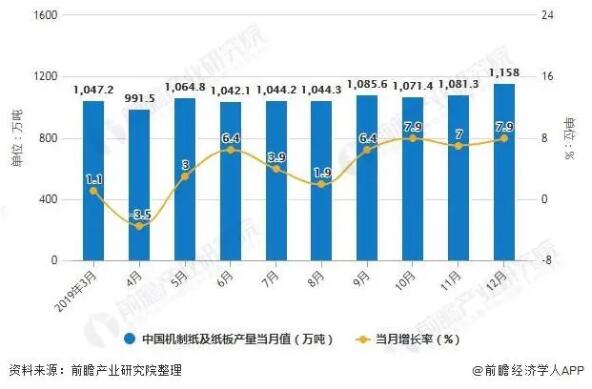 2019我國(guó)機(jī)制紙及紙板產(chǎn)量超1.25億 根據(jù)國(guó)家統(tǒng)計(jì)局?jǐn)?shù)據(jù)顯示,2018年全年中國(guó)機(jī)制紙及紙板(外購(gòu)原紙加工除外)產(chǎn)量累計(jì)達(dá)到了11660.6萬噸,累計(jì)下降1.5%。截止至2019年12月,中國(guó)機(jī)制紙及紙板(外購(gòu)原紙加工除外)產(chǎn)量為1158萬噸,同比增長(zhǎng)7.9%。累計(jì)方面,2019年1-12月中國(guó)機(jī)制紙及紙板(外購(gòu)原紙加工除外)產(chǎn)量達(dá)到12515.3萬噸,累計(jì)增長(zhǎng)3.5%。 2019年1-12月中國(guó)機(jī)制紙及紙板產(chǎn)量當(dāng)月值統(tǒng)計(jì)及增長(zhǎng)情況