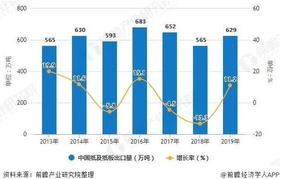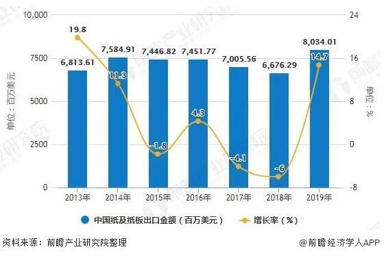 2013-2019年中國(guó)紙及紙板出口金額統(tǒng)計(jì)及增長(zhǎng)情況