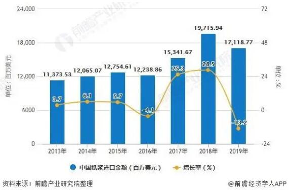 2013-2019年中國(guó)紙漿進(jìn)口金額統(tǒng)計(jì)及增長(zhǎng)情況