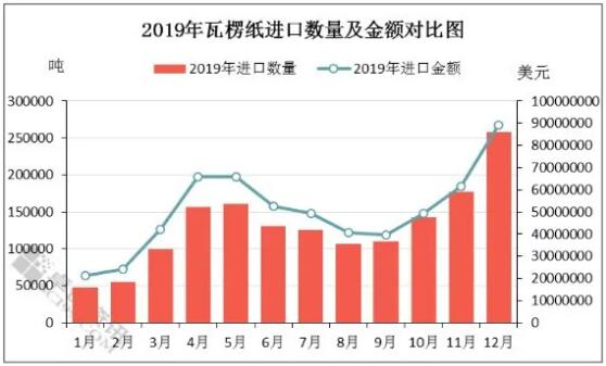 2016、2017兩年,國內成品紙價格暴漲,致使進口箱板紙和瓦楞紙市場逐漸打開,近幾年呈現總量快速增長的局面。2017-2018年,箱板瓦楞紙進口量持續攀升,據統計,2018年進口量增加近60%。 我們再來回顧一下2019年中國進口瓦楞紙的情況。 2019我國瓦楞紙進口情況回顧 2019,瓦楞紙進口量先增后降再大增 2019年中國的瓦楞紙進口量大致呈現先增后降再大增的走勢。 其中4-5月進口量增加,分別達到了15.67萬噸和16.10萬噸,主要因年初瓦楞紙價格處于上行態勢,貿易商進口積極性較高。 隨之國內紙價出現下滑,且利潤水平降低,自6月起進口量有所降低。8月下旬開始,紙價持續呈現上漲走勢,激發進口貿易商熱情,瓦楞紙進口量連續增加,12月進口量高達25.77萬噸。 年內進口量最低點出現在1月份,主要臨近春節假期,進口商陸續收市,此時進口量僅為4.81萬噸,較年內最高點降低了81.33%。