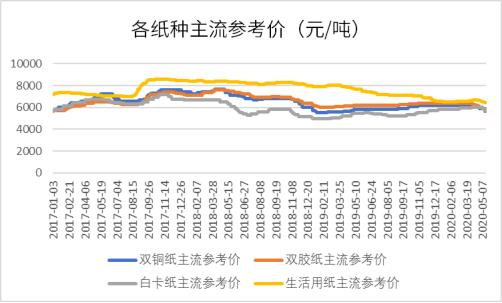 圖5.各紙種主流參考價(jià)4月下旬以來(lái)持續(xù)下降 從開工情況來(lái)看, 3月份白卡紙生產(chǎn)企業(yè)開工負(fù)荷率與2月持平,較去年同期減少6個(gè)百分點(diǎn)。3月月度產(chǎn)量較2月增加3.57%。4月份國(guó)內(nèi)生活用紙裝置整體開工負(fù)荷率變化不大,較3月下滑0.19個(gè)百分點(diǎn)。開工變化不大的原因?yàn)椋旱谝唬? 月份紙企陸續(xù)恢復(fù)正常開工,本月開工情況不多;第二,原紙市場(chǎng)供應(yīng)量開始增多;第三,安全衛(wèi)生事件影響,新增產(chǎn)線偏少。 文化用紙方面,4 月份銅版紙生產(chǎn)企業(yè)開工負(fù)荷率較3月下調(diào)8.13 個(gè)百分點(diǎn),銅版紙規(guī)模紙廠紛紛減產(chǎn),轉(zhuǎn)產(chǎn)力度加大,產(chǎn)量減少,開工負(fù)荷率下滑。雙膠紙生產(chǎn)企業(yè)開工負(fù)荷率較3 月下滑1.19 個(gè)百分點(diǎn)。部分規(guī)模紙廠轉(zhuǎn)產(chǎn),雙膠紙市場(chǎng)供應(yīng)壓力加大,加之下游需求支撐不足,供需矛盾較為明顯,多數(shù)廠家生產(chǎn)不積極。總體來(lái)看,4月下游紙種排產(chǎn)相對(duì)平穩(wěn),但因紙價(jià)跌勢(shì)難掩,紙廠原料采買積極性偏低,預(yù)計(jì)短期紙漿消耗速度仍有減緩可能,建議持續(xù)關(guān)注紙廠備貨策略的變動(dòng)。
