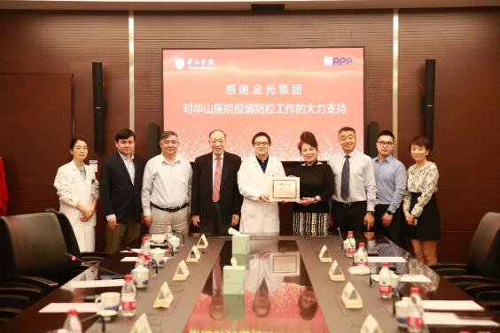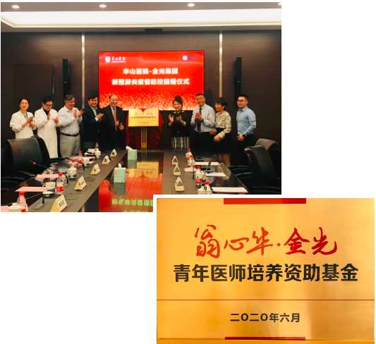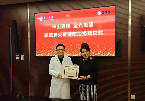 華山醫院向金光集團頒發捐贈贈書,對金光集團捐贈1000萬元支持疫情防控表示感謝 疫情發生后,作為愛國華僑,金光集團董事長兼總裁黃志源先生從第一時間就對中國疫情狀況表現出了深切的關注,并即刻做出捐贈的決定,通過中國華僑公益基金會捐款1億元人民幣和價值35萬元的清風衛生濕巾,用于抗擊新冠肺炎疫情。其中1000萬元定向資助華山醫院,開展新冠肺炎疫情防控人才關愛培養與公共衛生事件能級提升改造項目。該項目主要包括抗疫一線醫務工作者慰問金發放、翁心華青年醫師培養資助基金設立、醫院傳染病樓項目改造三部分內容。