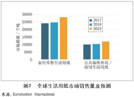 全球生活用紙市場規(guī)模 全球生活用紙行業(yè)市值約790億美元(2018年),包括家用零售生活用紙(AT,At-hometissue)和公共場所用/商用生活用紙(AFH,Away-from-hometissue)。 如圖1和圖2所示,全球生活用紙行業(yè)市值和銷量都呈平穩(wěn)增長態(tài)勢,無論是家用零售還是商用生活用紙市場都比較樂觀。生活用紙行業(yè)的增長與全球平均生活水平的提高和生活條件的改善息息相關(guān),雖然發(fā)達(dá)國家市場已經(jīng)基本飽和,增長潛力不大,但新興市場的崛起不斷為行業(yè)需求注入新的生機(jī),電子商務(wù)、直面消費(fèi)者的DTC模式等多元銷售模式的出現(xiàn)也刺激了生活用紙行業(yè)的發(fā)展。