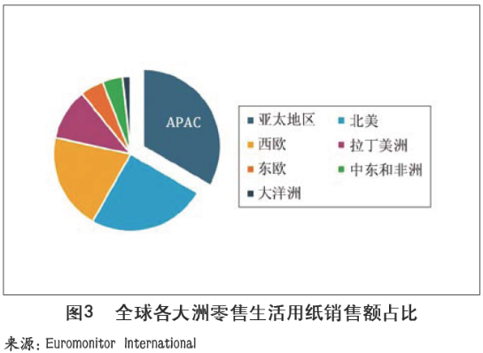 全球各地區(qū)生活用紙發(fā)展水平不均衡 如圖3所示,由于經(jīng)濟(jì)發(fā)展水平和生活習(xí)慣等差異,全球各大洲家用零售生活用紙市場發(fā)展水平各不相同,其中由于人口優(yōu)勢以及新興市場較多,亞太地區(qū)零售生活用紙銷售額占全球總額的33%,其次是北美、西歐、拉丁美洲、東歐、中東和非洲、大洋洲。其中西歐和北美市場發(fā)展較為成熟,開發(fā)潛力相對較小,而亞太地區(qū)尤其是東南亞,以及非洲的市場發(fā)展?jié)摿ψ畲蟆?/p>