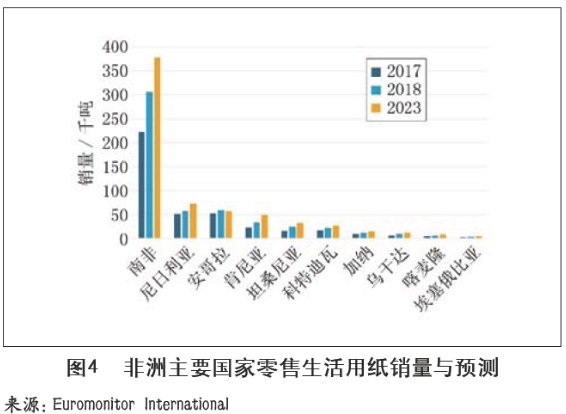 亞太地區(qū)生活用紙市場規(guī)模巨大,其中東南亞是增長最快的市場,由于新興國家較多,中產(chǎn)階級日漸龐大,未來市場仍有很大的增長潛力。亞太地區(qū)生活用紙領(lǐng)域具有以下發(fā)展趨勢: 第一,隨著中產(chǎn)階級日漸龐大,各生活用紙品牌持續(xù)創(chuàng)新,希望通過更高質(zhì)量的產(chǎn)品吸引中高收入群體。 第二,消費(fèi)者越來越關(guān)注環(huán)境和氣候變化,傾向于使用環(huán)保型產(chǎn)品,各生產(chǎn)商不斷推出環(huán)保型生活用紙。第三方安全認(rèn)證是重要的購買標(biāo)準(zhǔn),可以確保產(chǎn)品的安全問題,很多消費(fèi)者表示愿意花更多的錢購買安全放心的產(chǎn)品。 第三,亞太地區(qū)生活用紙企業(yè)不斷擴(kuò)充纖維種類,采用更多可持續(xù)的纖維,例如竹子和秸稈等。 非洲生活用紙市場發(fā)展水平整體偏低,但是增長較快。如圖4所示,作為發(fā)展水平較高的國家,南非零售生活用紙銷量明顯高于其他非洲國家,其次為尼日利亞、安哥拉、肯尼亞、坦桑尼亞、科特迪瓦、加納、烏干達(dá)、喀麥隆、埃塞俄比亞等。