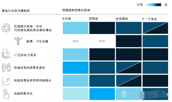 隨著包裝企業(yè)逐漸擺脫COVID-19危機的影響,他們需要重新調整企業(yè)發(fā)展的重點,并提高競爭能力,同時還要適應不斷變化的行業(yè)。 01、包裝方面的大趨勢 包裝公司將需要重新考慮其關注點和市場方法。我們預計,COVID-19大流行的影響將改變重要的大趨勢,而這些大趨勢已經(jīng)在危機之前重塑了包裝行業(yè),并提高了績效標準(圖1)。