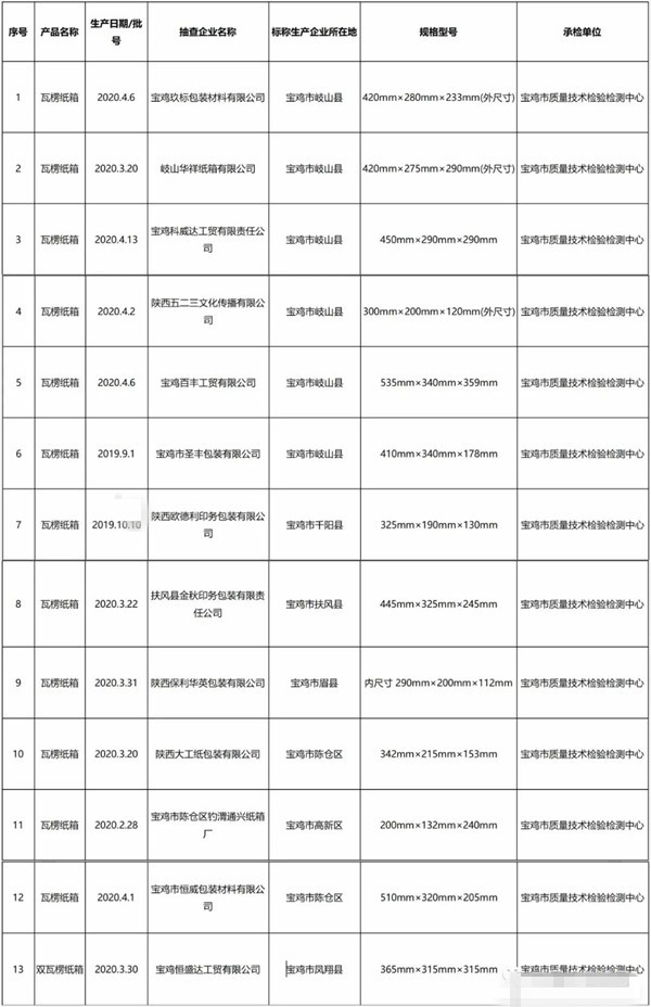 6月21日,筆者從陜西省寶雞市市場監(jiān)督管理局官網(wǎng)獲悉,該局于2020年3月26日至5月30日對瓦楞紙箱、蘋果育果紙袋等13種產(chǎn)品進行了質(zhì)量監(jiān)督抽查,并于近日公布了監(jiān)督抽查結(jié)果。 其中,在瓦楞紙箱方面,寶雞市市場監(jiān)督管理局對瓦楞紙箱的耐破強度、邊壓強度、粘合強度、空箱抗壓、接合、釘合(粘合)、壓痕線、外形結(jié)構(gòu)、搖蓋耐折、印刷、楞型、瓦楞紙板厚度、尺寸偏差等項目進行了檢驗。 本次所涉及的瓦楞紙箱在高新區(qū)、陳倉區(qū)、鳳翔縣、扶風縣、千陽縣、岐山縣的生產(chǎn)領(lǐng)域中抽取,共抽查紙箱生產(chǎn)企業(yè)13家,抽取樣品13批次,經(jīng)檢驗,合格樣品13批次。具體情況如下: