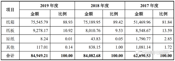 (龍利得2019年前十大客戶情況單位:萬元) 2019年主營業(yè)務(wù)收入達(dá)8.49億 近三年來,龍利得主營業(yè)務(wù)收入整體呈現(xiàn)出上升趨勢,2017-2019年分別為6.29億元、8.41億元、8.49億元。在產(chǎn)品結(jié)構(gòu)上,紙箱業(yè)務(wù)的營收占比在80%以上,且正在逐步上升,紙板、原紙及其他業(yè)務(wù)占總營收的比例逐步減小。 以最近的2019年為例,在龍利得8.49億元的主營業(yè)務(wù)收入中,有7.55億元來自紙箱產(chǎn)品,占比達(dá)88.93%;紙板產(chǎn)品帶來的營收為9278.17萬元,占比10.92%。而原紙及其他產(chǎn)品占比較小,營收分別為8.24萬元、117.01萬元。