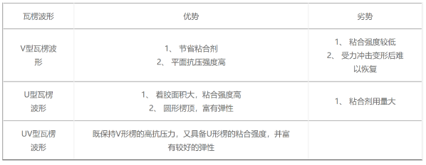 表1不同類型瓦楞原紙的環壓指數 2、原紙的緊度 緊度,是指每立方厘米的原紙的重量,是衡量原紙組織結構緊密程度的指標,決定著原紙的剛性、強度、透氣性和吸收性等特性。當多種原紙利用粘合劑粘合后,緊度高的原紙由于自身纖維具有較強的互相牽拉力,從而與粘合劑的結合效果好,整體的粘合強度高。反之,粘合劑則容易被原紙吸收分散,相同的施膠劑量,單位面積的膠量減少,降低了原紙間的粘合強度,間接影響了成品瓦楞紙箱的抗壓強度。 3、原紙的水分與施膠度 瓦楞紙箱所用的原紙一般由植物性纖維構成,經過一系列加工,會含有一定量的水分,正常應控制在9%~12%,利于瓦楞成型。若原紙含水量低于9%時,施膠后原紙會吸濕而產生氣泡,減少了瓦楞與面紙/里紙的粘結面積。若原紙含水量過高,則施膠易擴散,降低了粘合強度。 于此同時,施膠度也會對原紙的水分含量產生一定的影響。通常,在原紙生產中,施加一定量的耐水性的膠體物以提高原紙抗水性的工藝為施膠。這一工藝要求施膠度合理,才能使原紙不易吸濕,保持其含水量的穩定,進而保障成品紙箱的抗壓強度。但是,若施膠度過高,即水分含量較低,原紙纖維會變的松脆,影響成箱后的抗壓強度。若原紙的施膠度過低,則無法阻隔吸收外界的潮氣,造成原紙的含水量增高,纖維膨脹,環壓強度大幅降低。 二、瓦楞紙箱的成型工藝影響 1、瓦楞紙箱的棱形、波形 瓦楞紙箱的楞形一般分為A、B、C、E、K五種,其中前四種應用最為廣泛。A型楞是最先發明的一種瓦楞形狀,具有最大的瓦楞間距和高度,單位長度內瓦楞數量最少,這種形狀富有一定的彈性,能發揮良好的緩沖性能,承載較大的沖擊力;B型楞與A型楞截然相反,瓦楞高度最低,單位長度瓦楞密度大,紙板表面平整,具有較高的平壓強度,在外界壓力下不易變形,穩定性好。C型楞的楞高和單位長度內的瓦楞數均介于A型與B型之間,性能也介于二者之間。E型楞的瓦楞楞薄而密,其剛性和強度、手感硬度較好。 綜合以上各種楞形的特點,成箱后的抗壓強度從高到低依次為A、C、B、E。在實際應用中,為了獲得更高的抗壓強度,通常采用兩種或三種楞形結合的方式構成三層、五層或七層的瓦楞紙板。 除了楞形以外,構成瓦楞紙板的波形也會對瓦楞紙板和成箱的強度造成影響。V形、U形和UV型是三種主要波形,分別具有不同特征,如表2。從表中可以看出,UV型是一種理想波形,生產者亦可以根據實際需求選擇合適的波形。