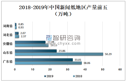 數據來源:中國造紙協會、智研咨詢整理 新聞紙是報刊及書籍的主要用紙,近年來,電子媒體盛行,報紙用紙量減少,新聞紙產量不復以往。2019年中國新聞紙地區產量排名第一帶的為廣東省38.06萬噸,第二名新聞紙產量為山東省23.86萬噸,第三名依舊是安徽省為17.48萬噸。 2018-2019年中國新聞紙地區產量前五