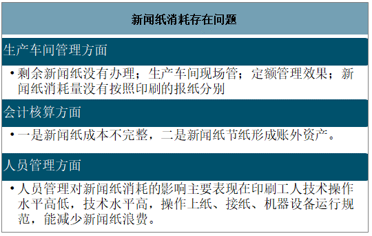 數據來源:智研咨詢整理 三、新聞紙消耗存在問題及解決方式 印刷結束后剩余新聞紙沒有辦理退庫,以新聞紙出庫量作為實際消耗量.虛增了新聞紙消耗量,易造成浪費。 隨意印前領用的新聞紙由物資部提前擺放到生產車間、剩余新聞紙也在生產車間存放,生產車間現場管理的標準寬松,或者標準執行不嚴格,地面臟亂衛生沒有及時打掃、人員隨意進出等,很容易造成新聞紙外皮刮擦等,形成廢紙,虛增新聞紙消耗量。 定額管理有效與否關鍵在于定額是否合理,定額制訂是需要多部門博弈、協商,受多個因素的影響.例如印量、新聞紙質量、人員技能水平的不同都會影響定額。 新聞紙消耗存在問題