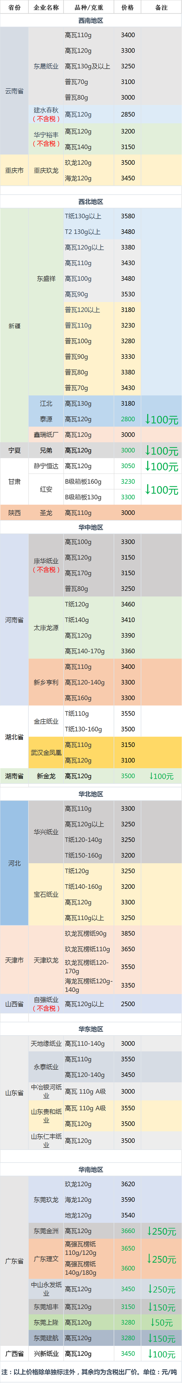 7月22日,全國多家紙廠下調包裝紙價格。廣東理文、東莞金洲、中山永發均下調250元,東莞旭豐、建航均下調150元,東莞上隆下調50元,廣西興新下調100元,新疆泰源、寧夏兄弟、甘肅紅安、靜寧恒達均下調100元,湖南新金龍下調100元。 1、全國35家紙廠最新包裝紙價格,降幅明顯