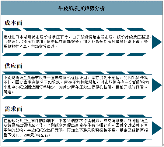 數據來源:智研咨詢整理 三、發展趨勢 從成本面來看,近期進口木漿現貨市場價格承壓下行,由于悲觀情緒主導市場,漿價持續承壓。從供應面來看,個別規模紙企從春節以來一直未有停機檢修計劃,庫存仍處于高位,去庫存情況不容樂觀,庫存壓力持續增加,對市場仍存有一定的影響力。從需求面來看,在全球公共衛生事件的影響下,下游終端需求持續萎靡,各地區紙企及貿易商出貨情況不佳,個別紙企為促出清庫存伴有小幅讓利。 目前國際上最流行的環保包裝材料之一,牛皮紙袋也將成為人們選擇最合適的替代品之一。 牛皮紙發展趨勢分析