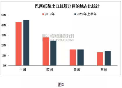 歐美市場搶紙新聞頻出供應重心仍往中國傾斜 2020年3月歐美地區疫情發展初期,當地超市衛生紙一搶而空消息頻頻出現在各大媒體,需求激增,出現巴西增加歐洲發運量預期。但隨著中國公共衛生事件得到控制和歐美地區疫情的不斷蔓延,巴西紙漿出口重心繼續向中國傾斜。如圖2所示是2020年上半年和2019年全年巴西出口總額分地區占比圖,具體表現為:美國占比基本持平,中國占比上升2個百分點至45%,歐洲下降3個百分點至25%。歐洲需求降低主要原因是文化用紙市場低迷,據歐洲印刷紙制造商協會數據顯示,2020年前4個月歐洲文化用紙需求量698萬噸,較去年同期下降14%,生活用紙雖短期需求激增,但持續性不強。中國市場方面,開工情況從二季度開始得到修復,紙漿消耗趨于穩定。綜合來看,歐美市場紙漿需求增長為“虛”,巴西紙漿供應重心向中國市場偏移為“實”。