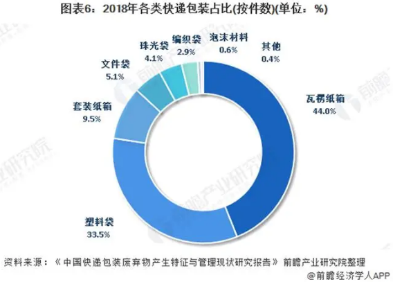 按照按照材質類型,可將快遞包裝材料分為紙質類和塑料類。2018年我國共消耗紙質類快遞包裝材料856.05萬噸,占快遞包裝材料的90.95%;塑料類包裝材料85.18萬噸,占快遞包裝材料的9.05%。 其中紙質包裝以瓦楞紙為主,占比高達96.18%;塑料類包裝材料主要包括塑料袋薄膜(不包括珠光袋和填充薄膜塑料)、編織袋、泡沫箱、珠光袋、膠帶和填充塑料等,其中普通塑料袋薄膜占比最高,質量占比達62.90%。對于快遞塑料袋薄膜,約占質量比例的80%是由廢料再生的,其廢棄物容易造成環境污染。