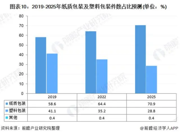 2019年,全國635.2億件快遞中,紙質包裝快遞占比約為58.6%(按2018年占比,包含瓦楞紙箱、文件袋、套裝紙箱),塑料包裝快遞占比約為41.1%(包含塑料袋、珠光袋、編織袋、泡沫材料),其它類型占比0.4%。 根據《關于進一步加強塑料污染治理的意見》規劃,到2022年,全國重點省市快遞塑料包裝將禁用不可降解塑料,2019年重點省市(北京、上海、江蘇、浙江、福建、廣東)快遞業務量占全國的48.17%,到2025年全國快遞禁用不可降解塑料。 取代不可降解塑料的材料一是紙質包裝(主要為瓦楞紙),二是可降解塑料,假設取代不可降解塑料材料中,有30%由紙質材料替代,70%材料由可降解塑料替代,則到2022年,塑料包裝快遞量占比下降至35.2%,到2025年下降至28.8%。