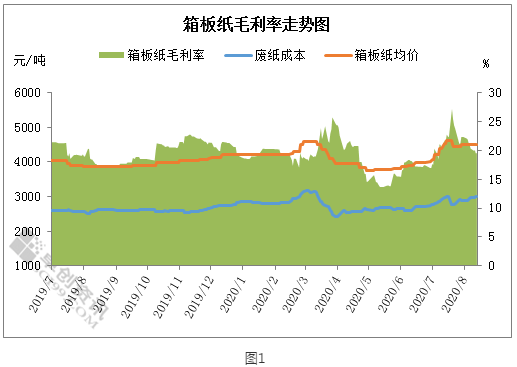 近一段時(shí)間以來,國(guó)內(nèi)箱板紙與廢舊黃板紙價(jià)格走勢(shì)呈現(xiàn)出一定的背離走勢(shì)。根據(jù)卓創(chuàng)資訊統(tǒng)計(jì)的國(guó)內(nèi)箱板紙均價(jià)與廢舊黃板紙均價(jià)看,箱板紙價(jià)格弱勢(shì)下滑,而廢舊黃板紙價(jià)格則呈上漲格局。卓創(chuàng)資訊監(jiān)測(cè)的箱板紙毛利率數(shù)據(jù)顯示,箱板紙毛利率已連續(xù)三周下行,紙企利潤(rùn)空間在不斷被壓縮。