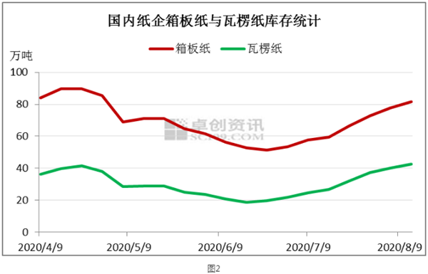 由于原紙需求減少,紙企原紙庫存也在大幅增加。根據(jù)卓創(chuàng)資訊統(tǒng)計(jì)的49家樣板紙企的箱板原紙周度庫存看,從7月2日當(dāng)周箱板原紙?jiān)黾右詠恚刂?月13日當(dāng)周,瓦楞原紙庫存增加幅度近60%。而瓦楞紙周度庫存較6月18日當(dāng)周的年內(nèi)低點(diǎn)增加了128%。包裝原紙庫存大幅增加的原因一方面是,國(guó)內(nèi)紙企的開工率保持相對(duì)高位;另一方面是則是下游原紙需求減弱,紙企原紙由主動(dòng)補(bǔ)庫存快速轉(zhuǎn)化為被動(dòng)補(bǔ)庫存。