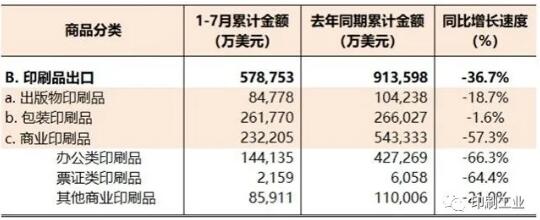 同期,國內(nèi)印刷品出口57.88億美元,同比下降36.7%(參見表3)。其中,出版物印刷品出口8.48億美元,同比下降18.7%;包裝印刷品出口26.18億美元,同比下降1.6%;商業(yè)印刷品出口23.22億美元,同比下降57.3%。 商業(yè)印刷品子項(xiàng)出口,辦公類印刷品14.41億美元,同比下降66.3%;票證類印刷品0.22億美元,同比下降64.4%;其他商業(yè)印刷品8.59億美元,同比下降21.9%。 表3 2020年1-7月國內(nèi)印刷品出口統(tǒng)計(jì)