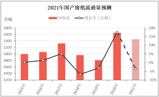 據卓創資訊數據顯示,2020年國產廢紙流通量為5652萬噸,同比增加17.51%,預計2021年國產廢紙流通量在5450萬噸,同比減少3.57%。2021年國內出口及消費仍將面臨壓力,廢紙回收基數不易增長。