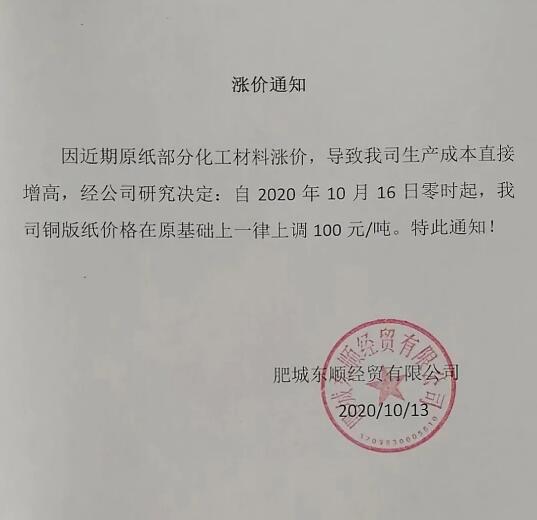 10月15日、16日,銅版紙大廠APP、晨鳴、華泰紙業發布漲價函,宣布11月文化紙價格再次上調300元/噸。 APP:受運營成本及多種因素影響,11月1日起,針對金東、金海所生產的全系各紙種、克重紙品價格在10月基礎上調漲300元/噸。