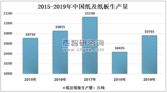 資料來源:中國造紙協會、智研咨詢整理 2019年全國紙及紙板生產量10765萬噸,相比2018年的10435萬噸,增長3.16%。消費量10704萬噸,同比增長2.54%。 2015-2019年中國紙及紙板生產量情況