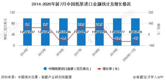 2020年1-7月中國(guó)紙漿進(jìn)口量累計(jì)超1700萬噸 據(jù)中國(guó)海關(guān)總署統(tǒng)計(jì)數(shù)據(jù)顯示,2019年去年中國(guó)紙漿進(jìn)口量達(dá)到了2720萬噸,累計(jì)增長(zhǎng)9.7%。截止至2020年7月中國(guó)紙漿進(jìn)口量為253萬噸,同比下降1.8%。累計(jì)方面,2020年1-7月中國(guó)紙漿進(jìn)口量累計(jì)達(dá)到1717萬噸,相比上年同期增長(zhǎng)了201萬噸,累計(jì)增長(zhǎng)13.3%。 在進(jìn)口金額方面,2019年去年中國(guó)紙漿進(jìn)口金額達(dá)到了17118772千美元(17118.77百萬美元),累計(jì)下降13.2%。截止至2020年7月中國(guó)紙漿進(jìn)口金額為1314042千美元(1314.04百萬美元),同比下降20.5%。 累計(jì)方面,2020年1-7月中國(guó)紙漿進(jìn)口金額累計(jì)達(dá)到8883778千美元(8883.78百萬美元),相比上年同期減少了1574441千美元,累計(jì)下降15%;2020年1-7月中國(guó)紙漿進(jìn)口均價(jià)為5174.01千美元/萬噸。