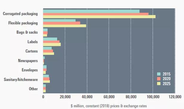 隨著全球經濟將逐漸從Covid-19的沖擊中復蘇過來,對印刷包裝的需求不斷增長,將確保柔印市場的真正增長。史密瑟斯公司的最新研究表明,柔印供應鏈必須進行創新,以保護市場免于轉向數字印刷機。 《到2025年的柔版印刷的未來》報告表明,到2020年,全球價值將達到1677億美元。由于大流行引起的經濟放緩,與2019年相比僅略有增長。盡管不是特別樂觀,但這種前景比許多競爭性模擬工藝要好得多。這主要是由于柔印在包裝和標簽作業中的廣泛使用。盡管對圖形和出版物的需求下降,但到2020年總印刷量將下降高達10.7%,這些通常保持良好。 隨著市場的復蘇,柔印預計將以1.6%的速度增長,到2025年將達到1,811億,而包裝將增加其市場份額。應對高通量噴墨威脅的生產創新是一項重大刺激,這也為印刷服務提供商、OEM、耗材和基材供應商帶來了機遇。 01、對包裝 柔印的四大最終用途應用都是包裝,并且大量使用紙和紙板基材。