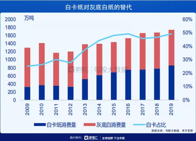 作為灰底白紙的重要產地,杭州富陽地區由于環保要求,在2019至2021年將累計減少約400萬噸產能,供給的下降將帶來灰底白紙產品的漲價,使很大一部分的需求被白卡紙替代。