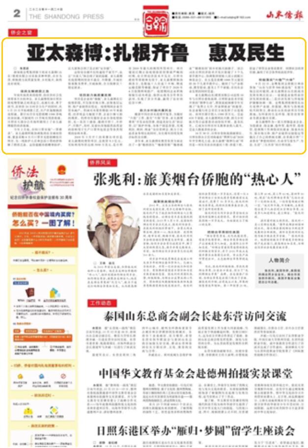 2019年3月開工的萊賽爾項目是亞太森博的增資項目,總投資9.3億元,實際利用外資達到3930萬美元,是日照市2019年最大的利用外資項目。項目建設后期正是疫情防控形勢最嚴峻的時期,在日照經濟技術開發區、日照市政府等幫助和支持下,亞太森博積極協調各方,克服施工人員返工不暢、物流運輸受阻等難題,保證了項目于2020年4月按期順利投產。疫情期間企業積極保銀行還本利息,保供應商及合作單位款項,實現了多方共贏,贏得了良好的信譽口碑。 助力鄉村振興惠民生 隨著中國經濟從疫情中復蘇,為做好“六穩”工作、落實“六保”任務,亞太森博秉承“開發永續資源、創造美好生活”的宗旨,以“保護環境,為客戶創造價值,實現利民、利國、利業”為經營理念,致力于在追求業務增長的同時,為實現可持續發展目標作出貢獻。 多年來,亞太森博在教育扶貧方面走出了一條“精準招生”“精準資助”“精準就業”“精準培訓”的鄉村振興新路子。該公司在日照經濟技術開發區捐建了3個兒童早教中心;集團創始人設立的陳江和基金會,在五蓮縣捐贈1000萬元建設的20個兒童早教中心,做到了與產業聯動,教育促動,惠及上千個家庭,市民在企業發展的同時受益。 亞太森博(山東)漿紙有限公司連續10年與日照市委統戰部、日照職業技術學院開展的“圓夢行動”,幫助家庭困難學生實現了“免費上大學、畢業即就業”的愿望,在企業履行社會責任方面發揮了示范效應。該項目累計投入1300多萬元,受益418個家庭。亞太森博利民興教、助力鄉村振興等公益慈善活動持續開展,惠及民生,已成為日照市對文教事業投入最大、受益人數最多的企業。 10月30日,日照市委統戰部副部長、日照市僑辦主任劉海誠在“圓夢行動”2020年開學典禮上說,亞太森博“圓夢行動”項目是一項實實在在的惠民工程、僑愛工程,彰顯了僑資企業情系教育、回饋社會的責任感,贏得了社會各界的高度評價。 積極落實“六穩”“六! 9月22日,金鷹集團主席陳江和在參加“山東與世界500強連線”東盟專場會議時提到,亞太森博在山東的成功發展有兩點啟示:一是制造業始終是經濟發展的根基;二是經濟發展與環境保護能夠協調一致。金鷹集團將繼續在山東延伸產業鏈、價值鏈,期待與各級政府共同努力,推動在山東的新項目盡快落地,為國家的生態環保、脫貧攻堅事業及就業做出貢獻。 亞太森博作為一家大型制造業企業,為穩就業、穩金融、穩外貿、穩外資、穩投資、穩預期工作和保居民就業、保基本民生、保市場主體、保產業鏈供應鏈穩定等做出了自己的積極貢獻,在承載日照“工業強市”夢想的同時,生動書寫著生產、生態、生活“三生共榮”的日照實踐。 。ū疚脑d于2020年11月20日·山東僑報)