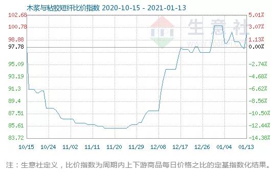2、1月13日木漿與瓦楞紙比價(jià)指數(shù)為103.97 生意社1月14日訊,1月13日木漿與粘膠短纖商品比價(jià)指數(shù)為99.97,較前一日上升了2.48點(diǎn),較周期內(nèi)最高點(diǎn)117.10點(diǎn)(2019-03-25)下降了14.63%,較2020年11月25日最低點(diǎn)85.30點(diǎn)上漲了17.20%。(注:周期指2019-01-01至今)