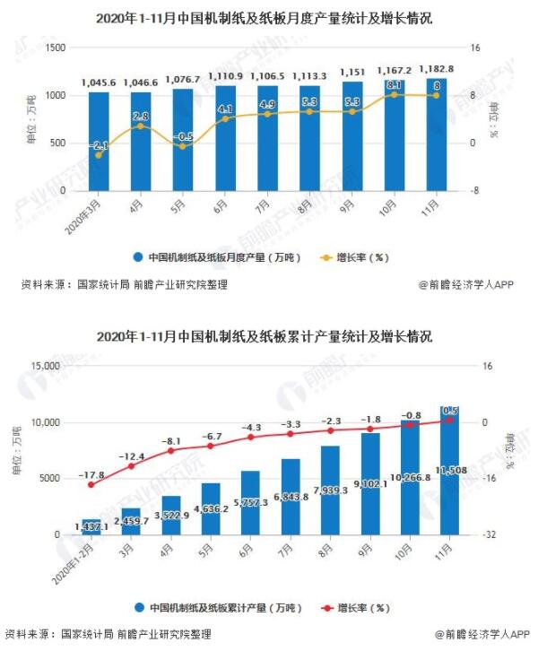 2020年1-11月中國機制紙及紙板累計產量超1.15億噸