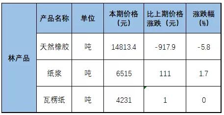 其中林產品領域,3月上旬與2月下旬相比,紙漿價格上漲111元,漲幅1.7%;瓦楞紙價格上漲1元,基本持平。