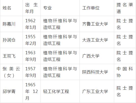 在環境與輕紡工程學部中,植物纖維科學與造紙工程專業共有四人入選,分別是齊魯工業大學陳嘉川教授、大連工業大學孫潤倉教授、廣西大學王雙飛教授和陜西科技大學張美云教授。另外,研究專業與造紙密切相關的廣東工業大學邱學青教授以輕工化學工程專業也入選了候選名單。