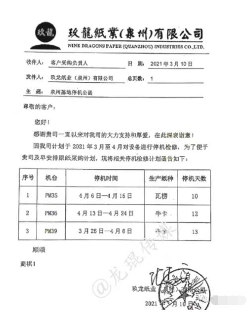 需求乏力,強勢如玖龍紙業,也不得不向市場屈服。近日,玖龍紙業又一個基地公布停機通知——重慶玖龍4臺紙機將在五月份全部停機12天。與此同時,玖龍紙業旗下多個基地原紙降價,降幅為100-400元/噸。 各類原紙價格下滑 4月20日,多個渠道傳出,天津玖龍紙業開始下調原紙價格。具體而言,再生紙、瓦楞紙、牛卡紙下調150元/噸,白面牛卡紙、涂布牛卡紙下調100元/噸,地龍灰底白下調300元/噸,江龍灰底白下調400元/噸。 100-400元/噸的降幅,似乎是今年在包裝紙行業首次見到。這也在一定程度上證明,面對下游需求乏力的現狀,作為龍頭紙廠的玖龍紙業也不得不向市場屈服。據了解,除天津基地外,玖龍紙業太倉、東莞、泉州、重慶、沈陽等基地亦在近期實施了降價或優惠的舉措。 目前市場仍處于淡季,下游包裝企業基本上以剛需采購為主,國內各大地區、各大紙廠的瓦楞紙、箱板紙等包裝紙出貨節奏放緩,價格出現不同程度的下滑。預計二季度,紙價將整體處于穩中有跌的走勢,二季度末或出現小幅反彈跡象,三季度或將重新升溫上調。 多個基地停機檢修 對于紙廠而言,應對市場景氣度不高的舉措主要有二,一是通過降價以抬高出貨量,二是通過停機檢修來減少供應量。以玖龍紙業為例,據筆者了解,除了原紙降價外,其多個基地的多臺紙機正處于停機檢修狀態或即將開始停機檢修。 4月17日,玖龍紙業重慶基地發布停機公函稱,因公司檢修安排,計劃在五月份全面停機檢修。該紙廠目前共有4條造紙生產線,主要生產牛卡紙、瓦楞紙和涂布灰底白板紙,年產能近200萬噸。其中: PM22機臺:生產白卡紙,5月18日到5月29日停機12天; PM23機臺:生產瓦楞紙,5月18日到5月29日停機12天; PM33機臺:生產白板紙,5月10日到5月21日停機12天; PM40機臺:生產低克重再生及瓦紙,5月10日到5月21日停機12天。  同時,玖龍紙業天津基地部分機臺正處于停機檢修狀態。根據停機公函,其PM34于4月26日至30日停機5天,PM25于4月6日至12日停機7天,PM26與4月6日至25日停機20天,PM27于4月20日至25日停機6天,PM31于4月13日至19日停機7天。  而玖龍紙業泉州基地部分機臺已在近期完成了停機檢修計劃。據悉,其PM35已于4月6日至4月15日停機10天,PM36已于4月13日至4月24日停機12天,PM39已于3月25日至4月6日停機13天。  可以說,整個三四月份以及即將到來的五月份,玖龍紙業都將面臨較大的市場壓力。這是紙品包裝產業鏈的淡旺季周期決定的,即便是產業鏈話語權極大的玖龍紙業,也難以改變。