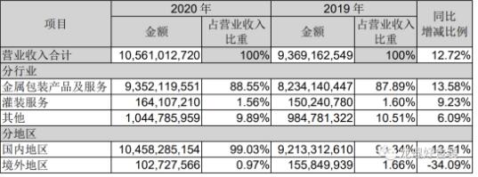 繼合興包裝、裕同科技之后,包裝印刷業第三家百億收入企業誕生!4月19日,奧瑞金科技股份有限公司公布2020年年度報告:實現營收105.61億元,同比增長12.72%;實現歸母凈利潤7.07億元,同比增長3.54%。  奧瑞金年收入突破百億元 與主營紙包裝的合興包裝、裕同科技不同,奧瑞金是一家金屬包裝企業,主要生產二片罐、三片罐等產品,服務于紅牛、東鵬特飲、百威啤酒、青島啤酒、燕京啤酒、雪花啤酒、加多寶、可口可樂、百事可樂、旺旺、天地壹號等快消品品牌。 財報顯示,在奧瑞金2020年的105.61億元收入中,金屬包裝產品及服務業務收入為93.52億元,同比增長13.58%,占總營收的88.55%;灌裝服務業務收入為1.64億元,同比增長9.23%;其他收入為10.45億元,同比增長6.09%。