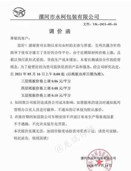 湖南龍發包裝有限公司 從2021年5月17日上午18點開始,紙板價格在現有價格基礎上上漲3%。  汕頭市萬豐紙品實業有限公司 從2021年5月15日上午8點開始,三層紙板每平方上漲0.03元/平方,四層紙板每平方上漲0.04元/平方,五層紙板每平方上漲0.05元/平方。