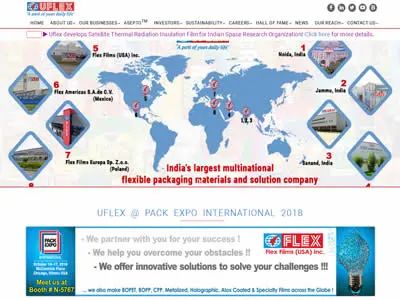 金達爾薄膜有限公司(indalPolyFilmsLimited)是金達爾集團旗下子公司,成立于1985年,總部位于印度新德里。金達爾薄膜有限公司以包裝和電影業務而聞名。它是聚酯和聚丙烯生產商,也是印度頂級電影制造公司之一。他們幾十年來一直在這個行業,并且是該行業的領導者之一。 5、Uflex