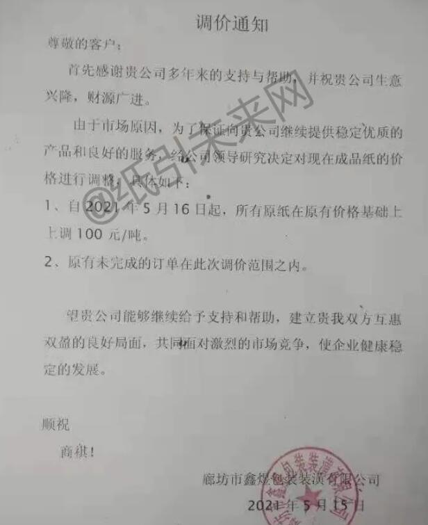 廊坊市鑫煜包裝裝橫有限公司:自2021年5月16日起,所有原紙在原有價格基礎上上調100元/噸。