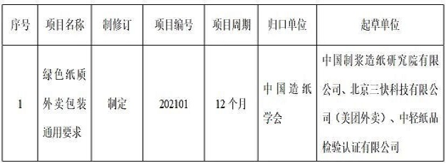 國家發展改革委和生態環境部于2020年1月聯合發布了《關于進一步加強塑料污染治理的意見》,明確規定:到2020年底,全國范圍餐飲行業禁止使用不可降解一次性塑料吸管;到2025年,地級以上城市餐飲外賣領域不可降解一次性塑料餐具消耗強度下降30%。截至目前,全國已有20多個省、直轄市和自治區相繼發布了新版“限塑令”。 為響應國家禁塑政策要求,支撐外賣行業綠色供應鏈建設,中國造紙學會紙基綠色包裝材料及制品專業委員會發起《綠色紙質外賣包裝通用要求》團體標準制定工作。 該標準適用于以紙為基材,可降解塑料淋膜或水性丙烯酸涂布的綠色紙質外賣包裝,包括飲具、餐具、包裝袋三大部分,涵蓋了紙杯、紙碗、紙餐盒、紙漿模塑、紙吸管、手提紙袋等產品;技術要求包括杯身挺度、抗壓強度、滲漏性能、耐熱性能、封合性能、可回收性、可降解性能、安全指標等要求。 歡迎有關單位積極參加團體標準的起草制定工作。 中國造紙學會紙基綠色包裝材料及制品專業委員會秘書處 聯系人:溫建宇劉振華 聯系方式:010-64778128010-64778158 郵 箱:bzh4215@126.comliuzh@cnppri.com 地址:北京市朝陽區望京啟陽路4號中輕大廈中國制漿造紙研究院 《綠色紙質外賣包裝通用要求》團體標準制定計劃項目表
