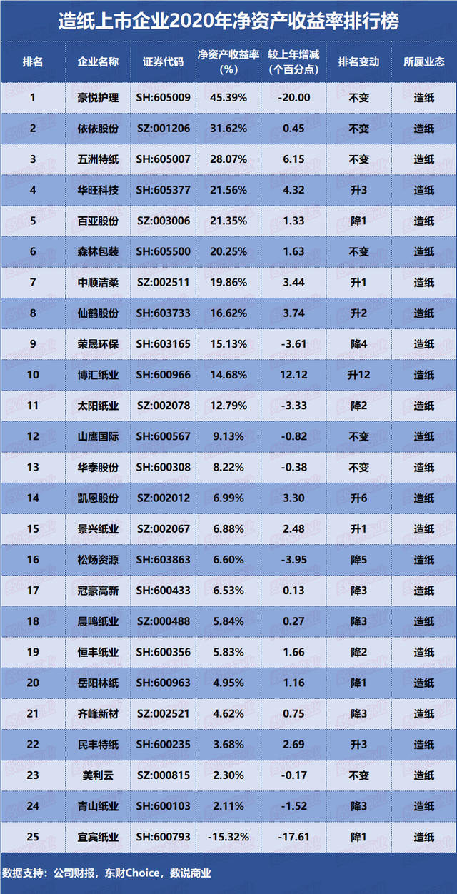 ▲造紙上市企業(yè)2020年扣非凈利潤排行榜 從扣非凈利潤規(guī)模來看,太陽紙業(yè)、山鷹國際、晨鳴紙業(yè)等3家企業(yè)扣非凈利潤在10億元以上;中順潔柔、博匯紙業(yè)、華泰股份等在內(nèi)的16家企業(yè)扣非凈利潤不足10億元; 凱恩股份、松煬資源、民豐特紙、美利云等4家企業(yè)扣非凈利潤不足1億元;宜賓紙業(yè)和青山紙業(yè)均為虧損。 從扣非凈利潤增幅來看,有19家企業(yè)扣非凈利潤實現(xiàn)正增長,其中18家企業(yè)增幅在兩位數(shù)以上,民豐特紙、博匯紙業(yè)、凱恩股份等3家企業(yè)實現(xiàn)倍數(shù)增長,民豐特紙增長最快,扣非凈利潤增幅達(dá)到435.42%。 其余6家企業(yè)扣非凈利潤均為下滑,其中松煬資源、美利云、宜賓紙業(yè)、青山紙業(yè)等4家企業(yè)下滑在兩位數(shù)以上,青山紙業(yè)下滑最大,扣非凈利潤下滑達(dá)到398.90%。 凈資產(chǎn)收益率 凈資產(chǎn)收益率體現(xiàn)了自有資本獲得凈收益的能力,是衡量股東資金使用效率的重要財務(wù)指標(biāo)。據(jù)數(shù)說商業(yè)統(tǒng)計,造紙上市企業(yè)2020年平均凈資產(chǎn)收益率為12.23%,較上年同期的12.46%,減少0.23個百分點。