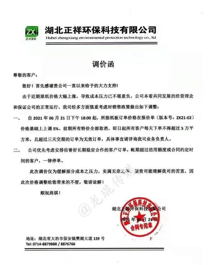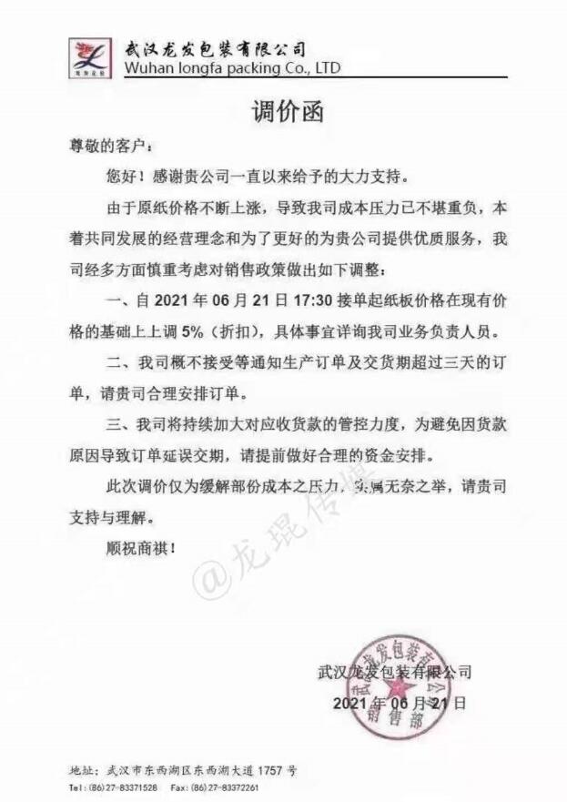 武漢龍發包裝有限公司 從2021年6月21日17點半接單起,紙板價格在現有價格基礎上上漲5%(折扣)。